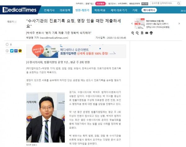 - 박석주 변호사, 개원가 법률사례 소개…환자기록 송부 기준 정확히 숙지해야
