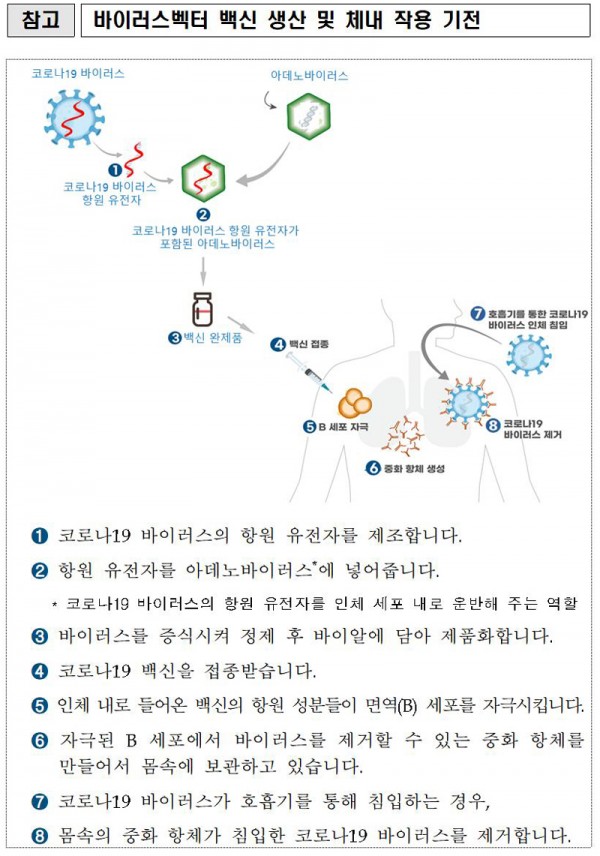 참고로 바이러스벡터 방식을 이용해 개발한 코로나19 백신으로는 미국 존슨앤드존슨사(얀센) 백신이 있습니다.