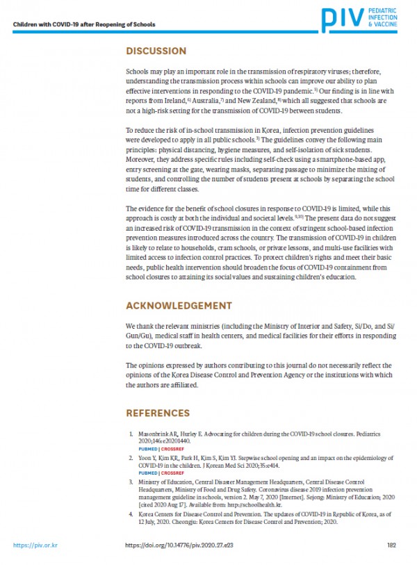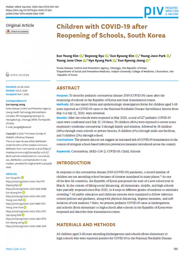 코로나19 감염예방을 위한 관리체계가 사전에 마련되고 준비된 경우 학교 내 코로나19 전파는 드물게 나타나는 것으로 최근 PIV(Pediatric infection & vaccine) 최신호에 질병관리청과 한림의대에서 공동으로 논문을 발표하였습니다.