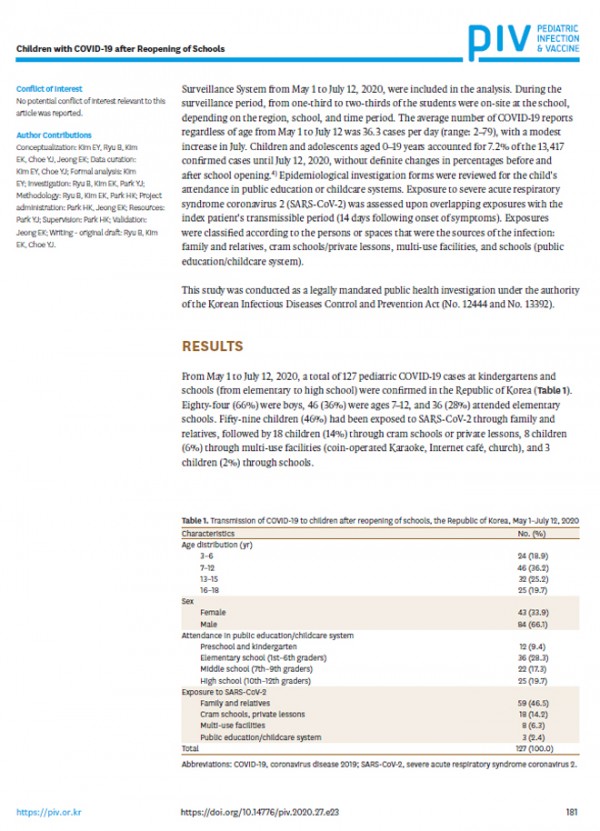 ▷결과: 2020년 5월 국내 초중고 학교 등교 재개 이후 7월 12일까지 총 127명의 소아 청소년 코로나19 확진자가 신고되었다. 그 중 59명(46%)은 가족 및 친지로부터 전파된 사례였으며 18명(14%)은 학원 및 개인교습 중 전파되었다. 8명(6%)은 다중이용시설에서 전파되었으며 3명(2%)은 학교에서 전파된 사례였다.