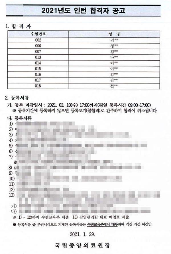 1월 29일 국립중앙의료원은 2021년도 인턴 전형 합격자를 발표하며 조씨의 불합격 소식을 전했다.