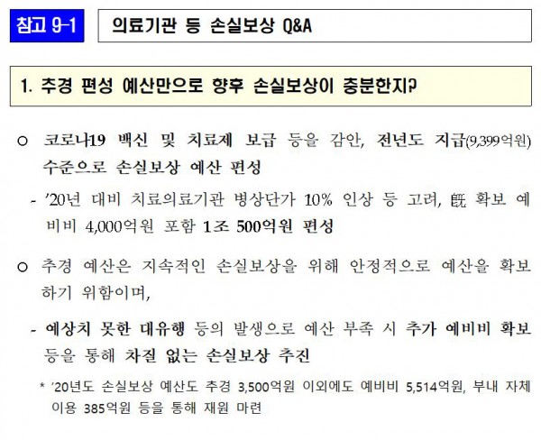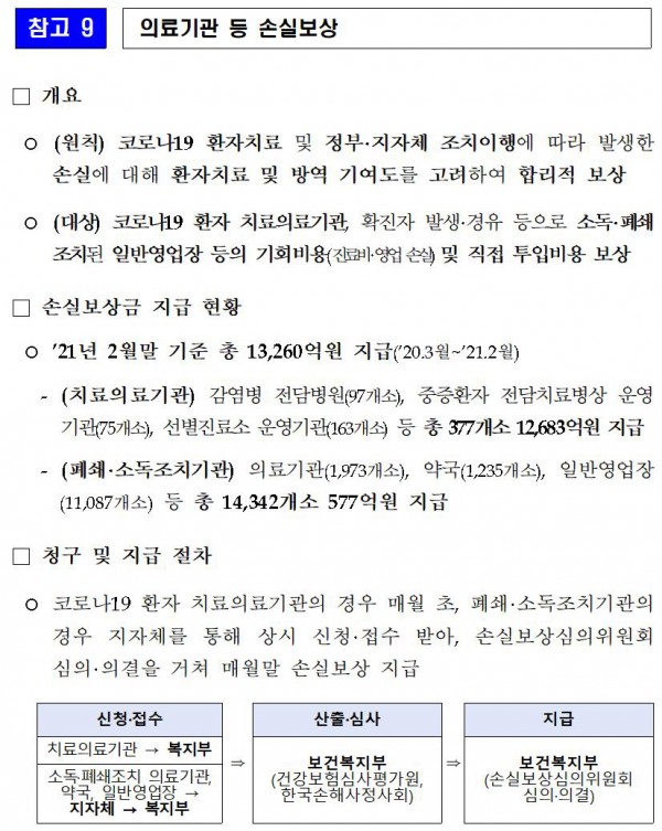 - (의료기관 등 손실보상) 코로나19 환자 치료의료기관 및 확진자 발생·경유에 따른 소독·폐쇄기관 손실보상 적기 지원 (+6,500억 원)