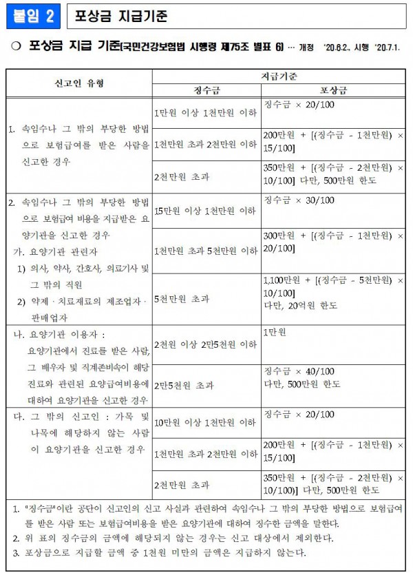 해당 제보가 요양기관의 부당청구 요양급여비용 환수에 결정적으로 기여하게 되면 징수된 공단부담금에 따라 요양기관 관련자의 경우에는 최고 20억원, 일반 신고인의 경우 최고 5백만원까지 포상금을 지급한다.