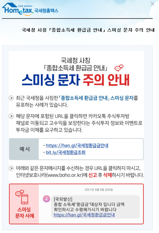 국세청 사칭 ‘종합소득세 환급금 안내’ 스미싱 문자 주의 안내 대피연 메일보내기 이름으로 검색 0 13,372 2021.04.13 18:44 첨부파일 - 첨부파일: 스미싱.png (270.3K) 517 짧은주소 - 짧은주소: https://www.laserpro.or.kr:443/bbs/?t=7RT 주소복사 × 짧은 글주소 복사 Note! 위 주소를 드래그, 복사(Ctrl+C)하여 사용하세요. 이전글다음글 목록 본문 국세청 사칭 ‘종합소득세 환급금 안내’ 스미싱 문자 주의 안내 이전글다음글 목록 댓글목록 등록된 댓글이 없습니다.