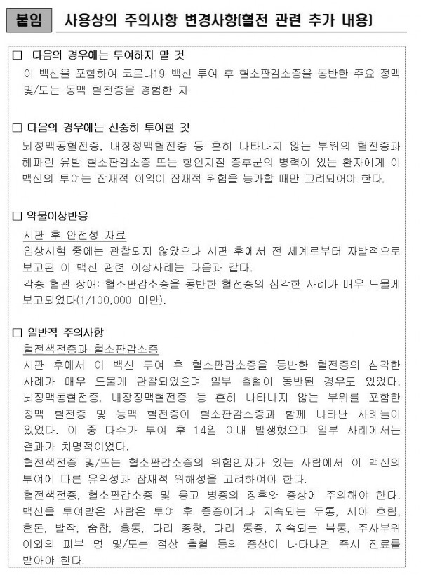 이에 따라 중앙약사심의위원회에서는 ‘혈소판감소증을 동반한 특이한 혈전증’에 대한 정보를 사용상의 주의사항에 추가하여 변경하는 것이 타당하다고 결론 내렸습니다.