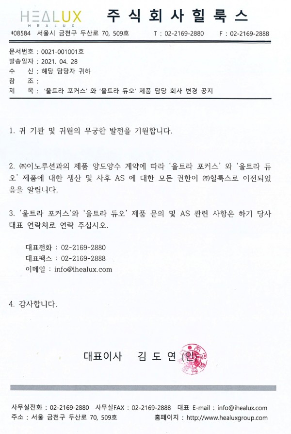 울트라 듀오, 울트라 포커스 제품 문의 및 AS ‘힐룩스(Healux)’로 변경