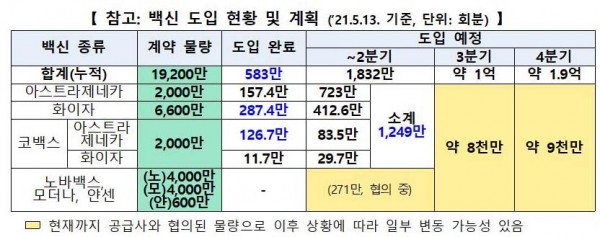 범정부 백신도입 TF(팀장: 권덕철 보건복지부 장관)는 코백스 아스트라제네카 백신 83.5만 회분이 5월 13일 19시 도착할 예정이라고 밝혔다.