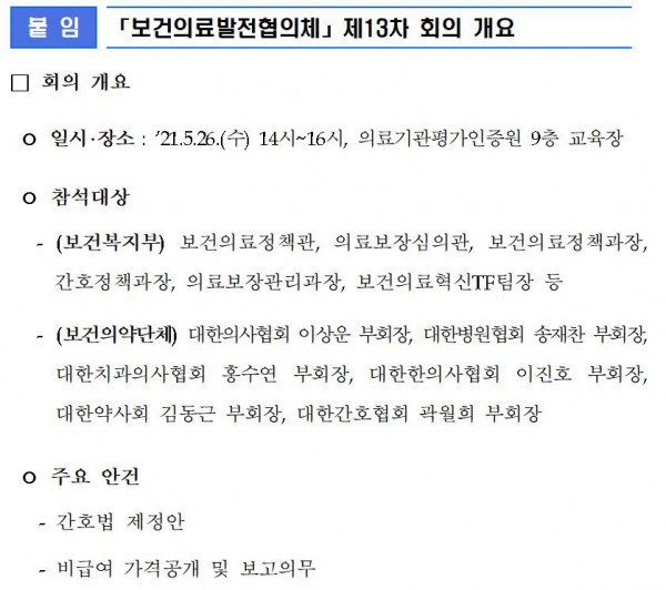 보건복지부(장관 권덕철)는 5월 26일(수) 의료기관평가인증원에서 의약단체들과「보건의료발전협의체」제13차 회의를 개최하였다.
