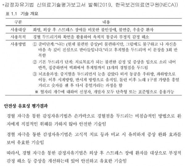 이는 2019년 한국보건의료연구원(NECA)이 ‘경혈 자극을 통한 감정자유기법’을 신의료기술로 인정한 것에 대한 후속 조치이다.