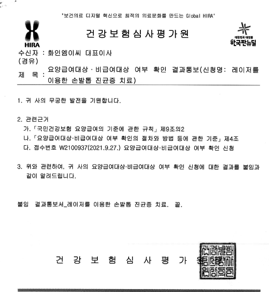 [화인엠이씨]노블린Nobleen ‘레이저를 이용한 손발톱 진균증’ 치료에 대한 보험수가(비급여) 획득, 실비보험 적용