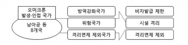 - 오미크론 발생·인접국가 아프리카 8개국 방역강화국가, 위험국가, 격리면제 제외국가로 지정