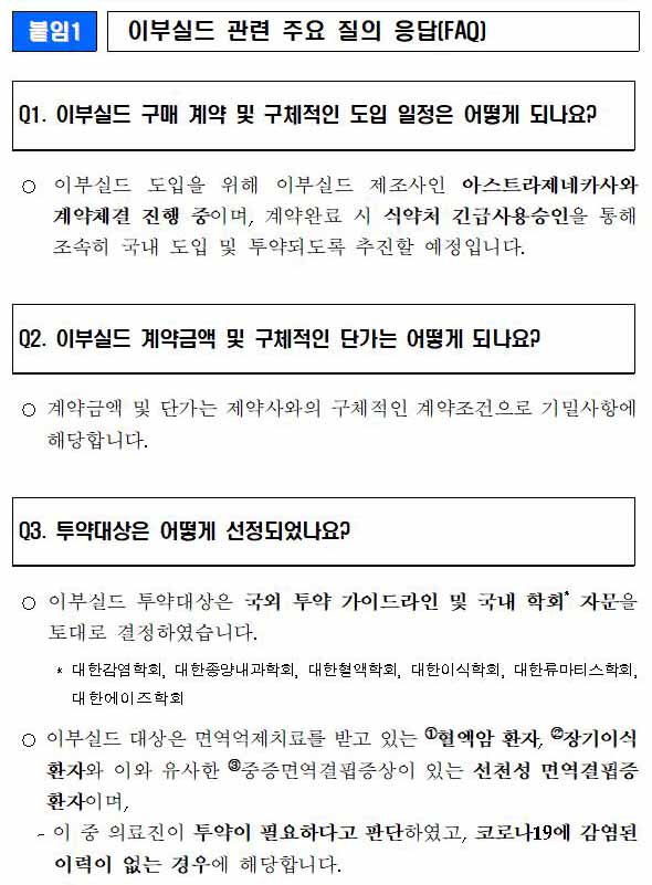 - 확정된 2만 회분에 대한 구매계약을 체결하기 위해 이부실드의 제조사인 아스트라제네카사와 협의 중에 있으며, 계약 체결 후 식품의약품안전처 긴급사용승인을 거쳐 신속하게 국내 도입과 투약을 실시할 예정이다.