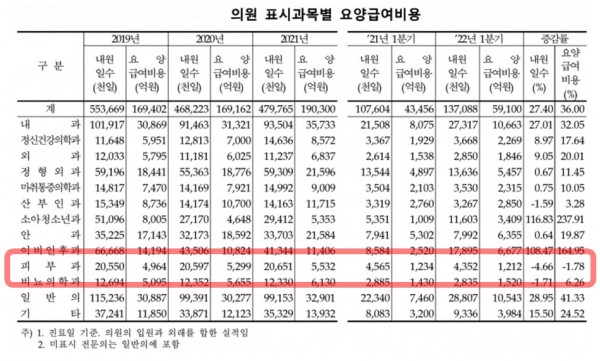 다만 피부과는 내원일수 4.66%, 급여비 1.78%가 감소했다.