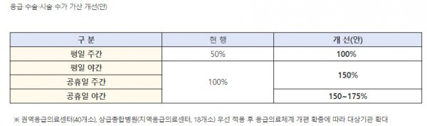 - 뇌동맥류, 중증외상 등의 야간․휴일 응급 수술, 시술에 대해 가산율을 큰 폭으로 인상하고, 응급실에 내원한 중증 환자의 신속한 후속 진료 연계를 위해 응급전용입원실 관리료를 신설한다.
