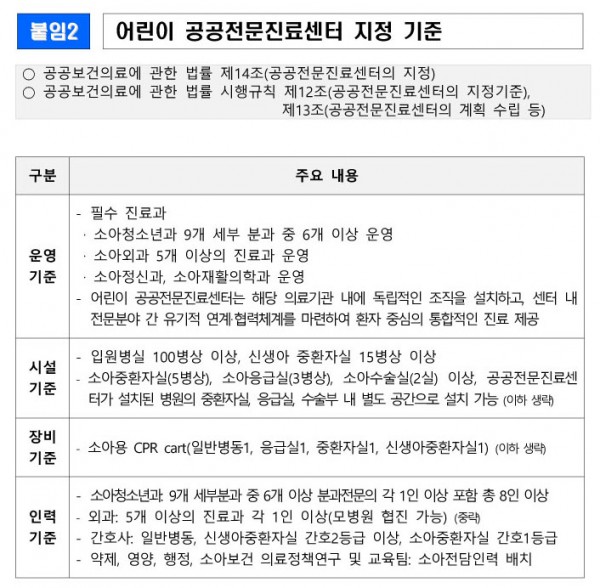 <붙임2> 어린이 공공전문진료센터 지정기준