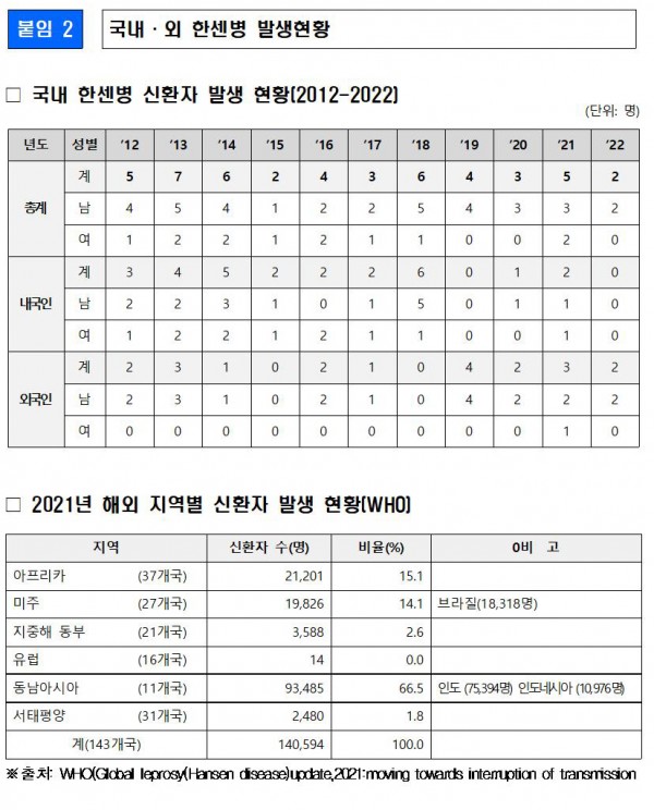 □ 질병관리청은 한센병 종식을 위해서는 외국인 신환자의 조기발견과 치료가 중요하다고 보고, 외국인 대상 한센병 검진 사업을 강화할 계획이다.
