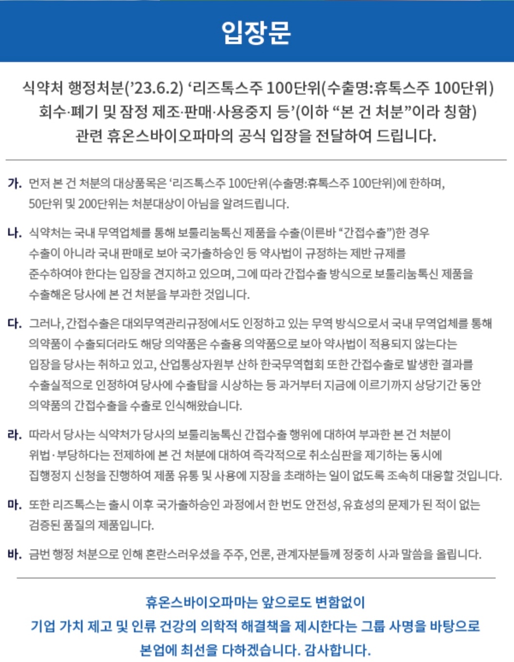 [식약처]㈜휴온스바이오파마, ‘리즈톡스주100단위’ 허가취소 및 회수·폐기(휴온스 측 입장문)