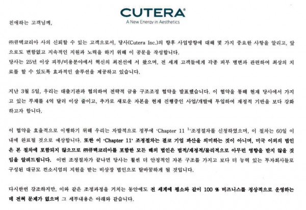 [큐텍 코리아]큐테라CUTERA 자발적 파산보호신청 후 비상장전환에 따른 안내문