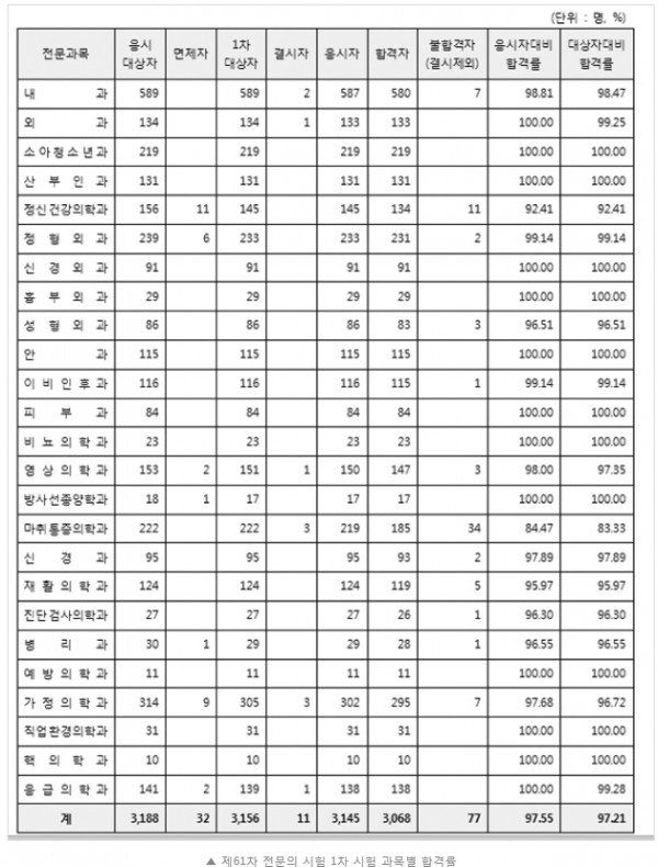 제61차 전문의 시험 1차 시험에서 3145명이 응시해 3068명이 합격하면서 97.55%의 합격률을 기록했다.
