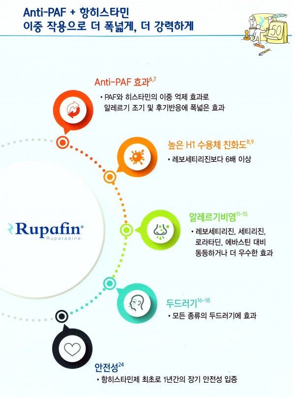 정리하자면, rupatadine은 강력한 효과를 가지는 선택적 항히스타민제로 알레르기비염의 중요한 매개체인 PAF를 억제하는 효과도 나타낸다. 또한 코막힘을 비롯한 알레르기비염 증상에서 기존의 항히스타민보다 더 나은 완화를 보여주며 한국인 환자에서의 유효성과 안전성이 증명됐다.