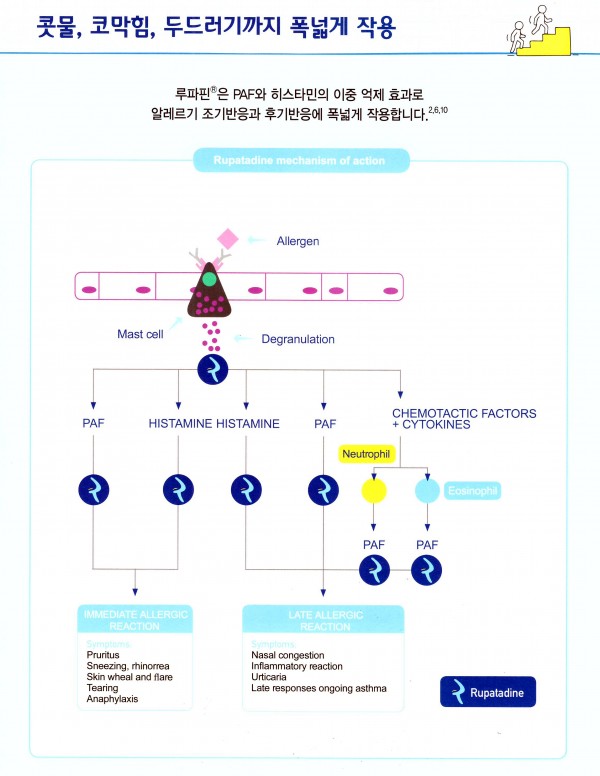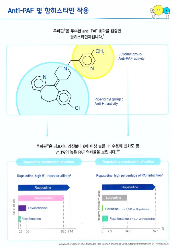 루파핀은 항히스타민 효과 외에 다양한 염증 반응에 관여한다고 알려진 혈소판활성인자(PAF)를 억제하는 이중 작용을 함으로써, 다른 성분에 비해 광범위하고 강력한 알레르기 반응 억제 및 항염증 효과를 지닌 것으로 알려져 있습니다.