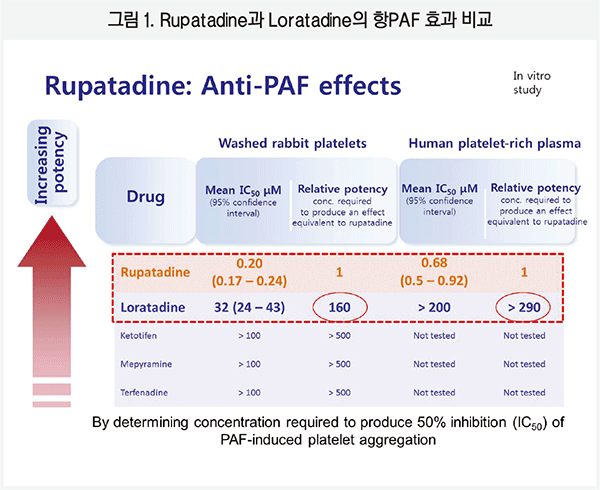 Desloratadine과 levocetirizine과 같은 다른 항히스타민제와 비교했을 때 rupatadine만이 항PAF와 관련된 비만세포 탈과립의 억제효과를 나타냈다.