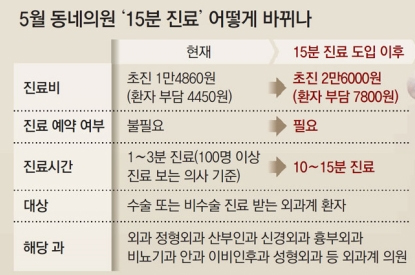 현재는 의사의 진료시간이 1분이든, 15분이든 상관없이 환자 한 명당 초진 기준으로 동네의원 진찰료가 1만4860원이다. 환자를 많이 볼수록 이득인 만큼 진료시간이 짧아질 수밖에 없다. 건정심은 동네의원의 15분 진료 정착을 위해 진찰료를 2만6000원 수준으로 올릴 예정이다.