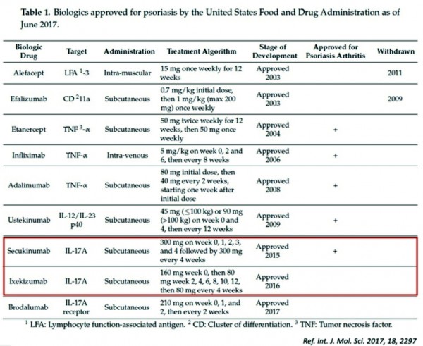 - 생물학적 건선 치료제 현황(2017년 6월 미 FDA 등록 기준)