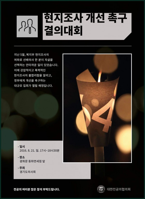 안산시 비뇨기과 원장님 추모대회 및 현지조사 개선 촉구 결의대회 안내 김지훈 메일보내기 이름으로 검색 0 14,309 2016.08.16 18:14 짧은주소 - 짧은주소: https://laserpro.or.kr:443/bbs/?t=uz 주소복사 × 짧은 글주소 복사 Note! 위 주소를 드래그, 복사(Ctrl+C)하여 사용하세요. 이전글다음글 목록 본문 [경기도의사회]안산시 비뇨기과 원장님 추모대회 및 현지조사 개선 촉구 결의대회 안내복지부 현지조사후 안산시 모 비뇨기과 원장님의 자살 후 현지조사 개선 요구에 대한 의사회원들의 열기가 타오르고 있습니다. 본회는 현재조사 개선을 촉구하고자 다음과 같이 집회를 개최합니다. ▶일시 : 2016년 8월21일(일) 오후 5시~6시30분▶장소 : 서울 광화문 동화면세점 앞(동아일보 사옥 맞은편)▶주최 : 경기도의사회 많은 참석 부탁드립니다. 작은 행동이 큰 변화를 만들어 낼 수 있습니다. 이전글다음글 목록 댓글목록 등록된 댓글이 없습니다.