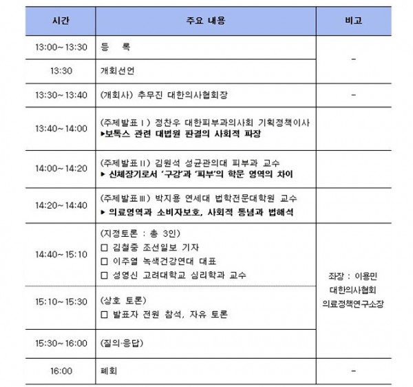 이날 토론회에서는 정찬우 대한피부과의사회 기획정책이사가 '보톡스 관련 대법원 판결의 사회적 파장', 김원석 성균관의대 피부과 교수가 '신체장기로서 구강과 피부의 학문 영역의 차이', 박지용 연세대 법학전문대학원 교수가 '의료영역과 소비자보호, 사회적 통념과 법해석'을 주제로 각각 발표할 예정이다.