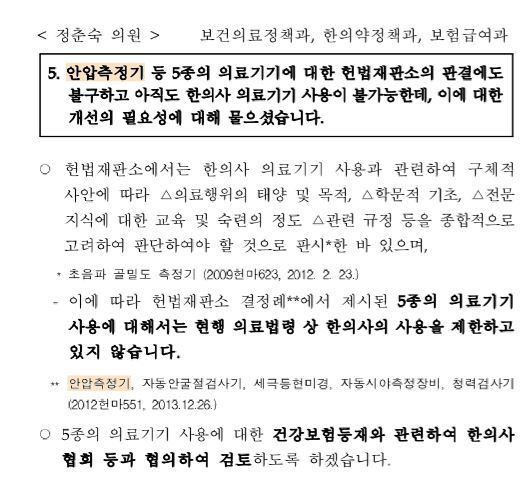 6일 의료계에 따르면 보건복지부 보건의료정책과, 한의약정책과, 보험급여과 등은 공동으로 최근 국회 보건복지위원회 정춘숙 의원(더불어민주당)에게 “안압측정기 등 5종의 의료기기에 대한 헌법재판소의 판결에도 아직도 한의사 의료기기 사용이 불가능하다. 이에 대한 개선의 필요성이 있나"라는 국정감사 질의에 대한 서면답변서를 제출했다.