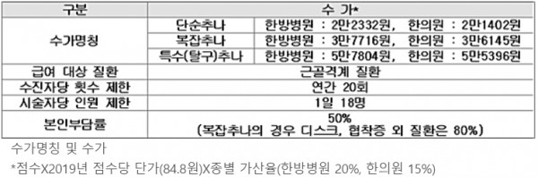 수가는 본인부담 50%를 포함해, 한의원의 경우 단순·복잡·특수추나 각각 2만 1402원, 3만 6145원, 5만 5396원이며 한방병원의 경우 각각 2만 2332원, 3만 7716원, 5만 7804원 등으로 결정됐다.