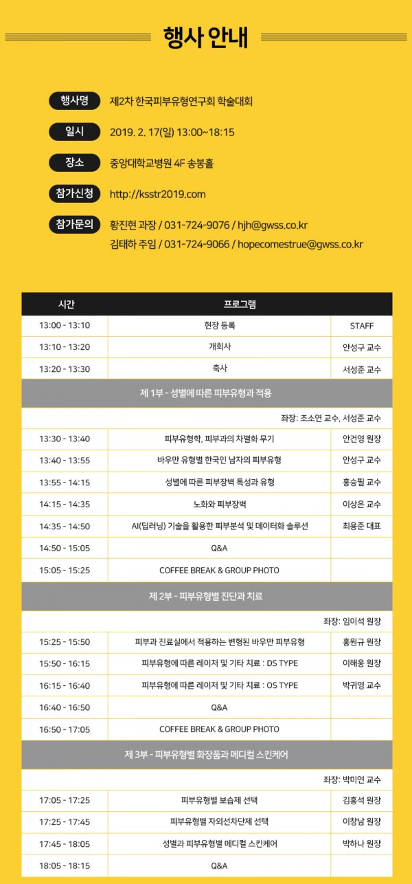 금번 학술대회는 피부유형학에 대한 기초 공부부터 임상에 바로 적용할 수 있는 유형별 진료 노하우까지 알찬 내용으로 준비했습니다.