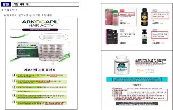 - (의약품 오인·혼동) A사 제품은 ‘탈모방지, 출산 후 머리빠짐에 효과’, B사 제품은 ‘임상적으로 탈모예방 및 남성호르몬 개선에 좋은 효과가 있다’ 등 의약품으로 오인·혼동 우려가 있도록 광고하였습니다.