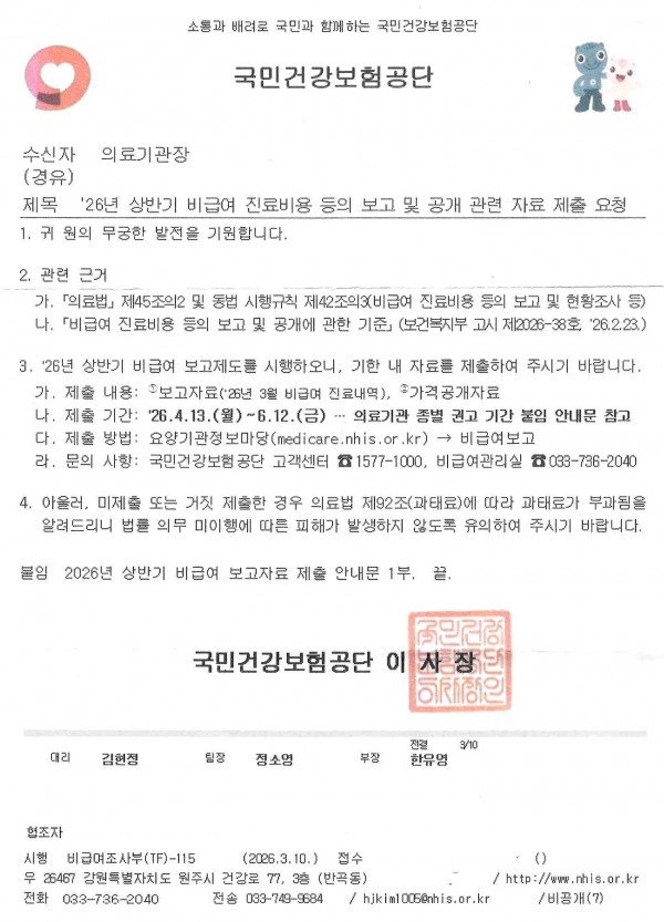 [건보공단]‘26년 상반기 비급여 진료비용 등의 보고 및 공개 관련 자료 제출 요청(6.12.마감)
