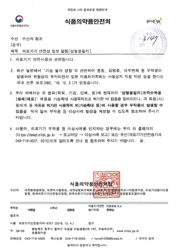 첨부파일: (식약처 공문) 의료기기 안전성 정보 알림 [성형용필러]