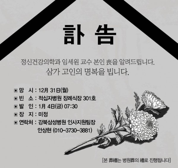 12월 31일 오후 6시경 서울 종로구 강북삼성병원 정신건강의학과 임모 교수가 외래에서 환자가 휘두른 칼에 찔리는 사건이 발생했다. 가슴을 흉기에 찔린 의사는 심폐소생술에 이어 응급수술을 받았으나 오후 7시 30분 사망했다.