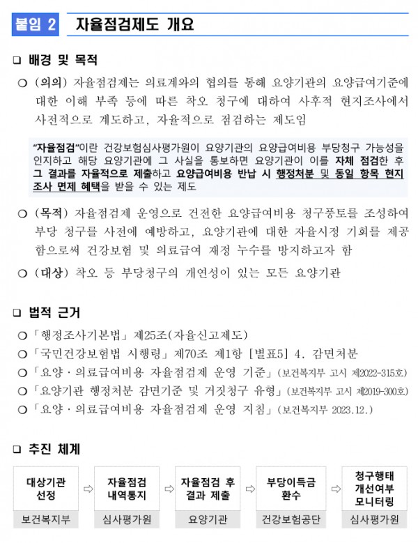 또한, 자율점검 통보대상이 아니더라도 건강보험심사평가원 요양기관 업무포털 사이트(biz.hira.or.kr)에 착오 등에 따른 부당청구 자진 신고가 가능하며, 이 경우 현지조사 및 행정처분을 면제한다.