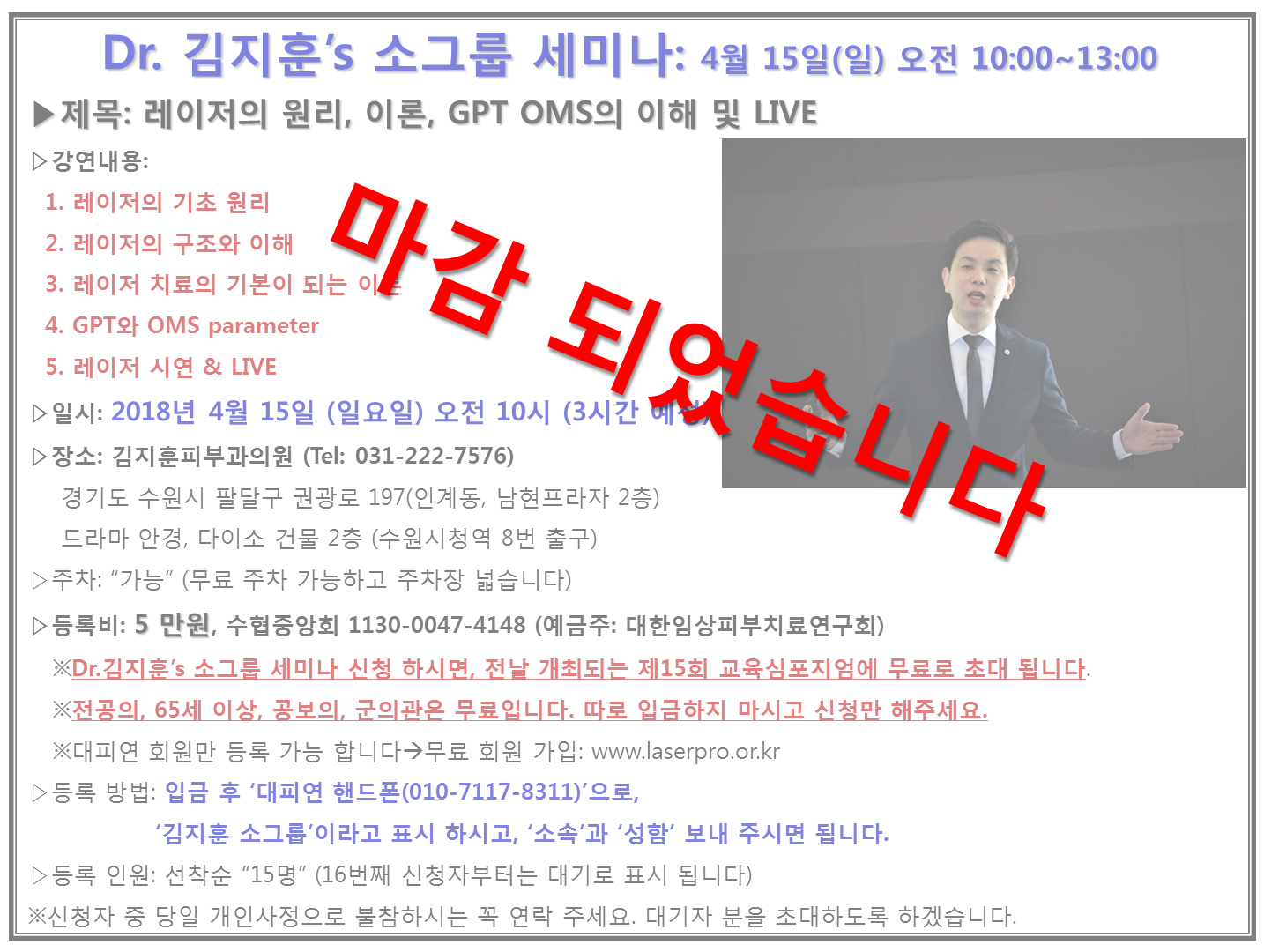 ※4월 15일 (일요일) 개최되는 Dr.김지훈‘s 소그룹 세미나에 등록하신 회원님은 별도 등록없이 이번 교육 심포지엄에 무료로 초대 됩니다.