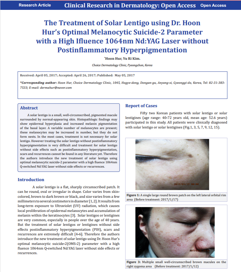 ▶Solar lentigo를 OMS-2 Parameter로 치료한 논문이 Clinical Research in Dermatology에 통과되어 galley proof가 왔는데, 오타가 있어서 논문 교정해서 보냈습니다.