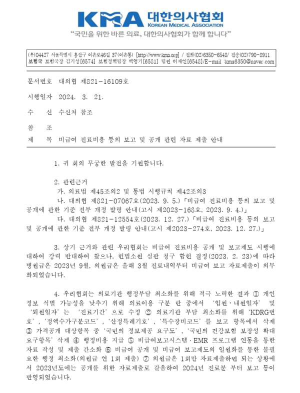 [의협]비급여 진료비용 등의 보고 및 공개 관련 자료 제출 안내