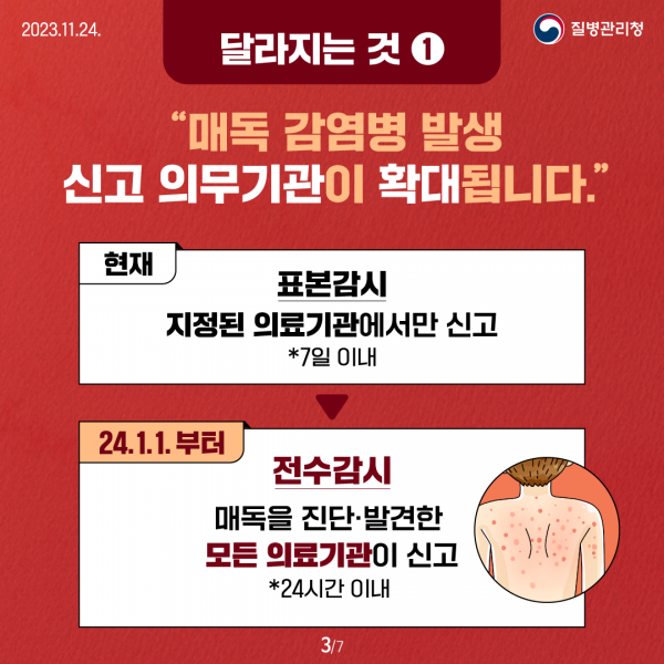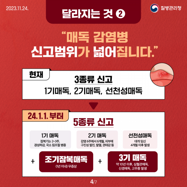 [질병청]2024년부터 매독에 대한 국가 감시체계가 강화(3급 감염병, 전수검사, 조기잠복.3기매독도 신고) 대피연 메일보내기 이름으로 검색 0 10,549 2023.11.30 11:42 첨부파일 - 첨부파일: 01.png (965.0K) 83 - 첨부파일: 02.png (747.8K) 64 - 첨부파일: 03.png (711.0K) 87 - 첨부파일: 04.png (714.3K) 104 - 첨부파일: 05.png (773.7K) 65 짧은주소 - 짧은주소: https://laserpro.or.kr:443/bbs/?t=cU5 주소복사 × 짧은 글주소 복사 Note! 위 주소를 드래그, 복사(Ctrl+C)하여 사용하세요. 이전글다음글 목록 본문 [질병청]2024년부터 매독에 대한 국가 감시체계가 강화(3급 감염병, 전수검사, 조기잠복.3기매독도 신고) 이전글다음글 목록 댓글목록 등록된 댓글이 없습니다.