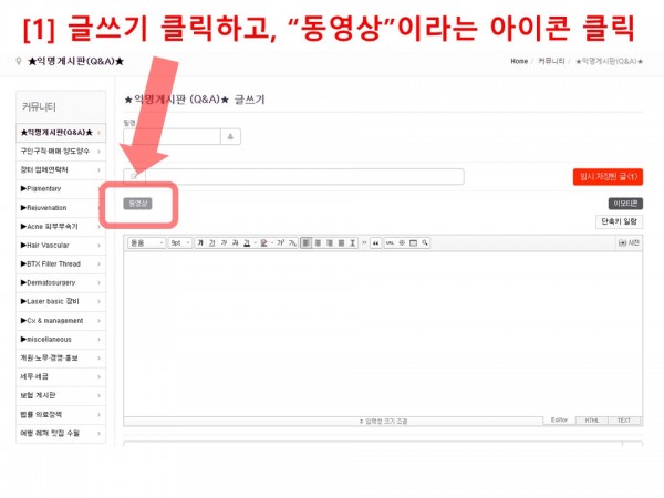 [1] 익명게시판 들어가서 글쓰기 클릭하고, “동영상”이라는 아이콘 클릭합니다.