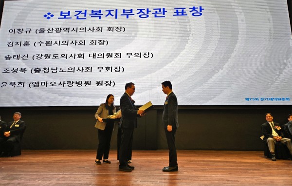 대피연 김지훈 부회장(제29·30대 수원시의사회 회장)이 2023년 4월 21일 개최된 ’제75차 대한의사협회 정기대의원총회‘에서 ’보건복지부장관 표창‘을 수상하였습니다.