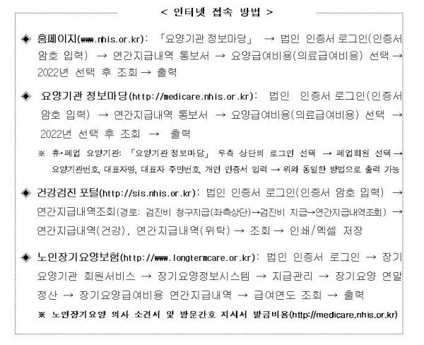 ▷홈페이지(www.nhis.or.kr): 「요양기관정보마당」 → 법인 인증서로그인(인증서 암호 입력) → 연간지급내역 통보서 → 요양급여비용(의료급여비용) 선택→ 2022년 선택 후 조회→ 출력