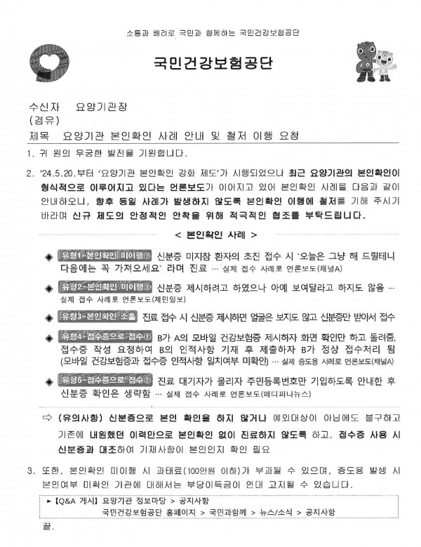 [건보공단]요양기관 본인확인 사례 안내 및 철저 이행 요청.신분증 대피연 메일보내기 이름으로 검색 0 4,422 2025.04.07 17:24 첨부파일 - 첨부파일: [건보공단]요양기관 본인확인 사례 안내 및 철저 이행 요청.jpg (962.4K) 254 짧은주소 - 짧은주소: https://www.laserpro.or.kr:443/bbs/?t=feV 주소복사 × 짧은 글주소 복사 Note! 위 주소를 드래그, 복사(Ctrl+C)하여 사용하세요. 이전글다음글 목록 본문 [건보공단]요양기관 본인확인 사례 안내 및 철저 이행 요청.신분증 이전글다음글 목록 댓글목록 등록된 댓글이 없습니다.