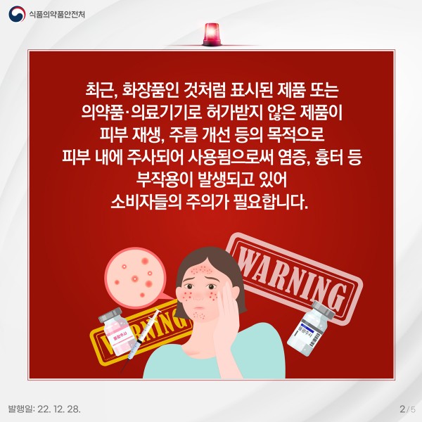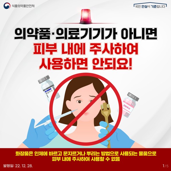 □ 식품의약품안전처(처장 오유경)는 피부 재생, 주름 개선 등을 위해 주사기, 미세 바늘 등을 활용해 피부 내에 주입해 사용하는 의약품·의료기기에 대한 ▲사용 시 주의사항 ▲구별 방법 등 안전 사용 정보를 제공합니다.