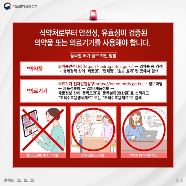 식약처는 최근 시중에서 의약품 또는 의료기기로 허가받지 않은 제품이 피부 재생, 주름 개선 등을 목적으로 판매*되고 있어 소비자의 각별한 주의와 이러한 제품을 구매하지 말 것을 당부했습니다.