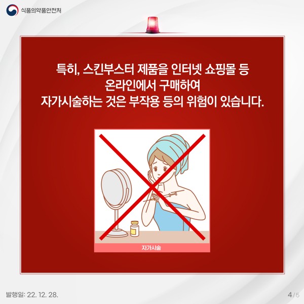 ※ ‘주름 개선 등’을 목적으로 피부에 주입해 사용하는 의약품·의료기기가 일명 ‘스킨부스터’로 유명세를 타며 시중에서 허가받지 않은 제품을 ‘스킨부스터’ 제품으로 광고·판매하는 경우가 있음
