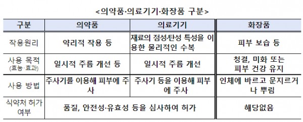 [식약처]피부 재생, 주름 개선 등 목적으로, 피부 내 주입은 의약품·의료기기만 가능(의약품.의료기기.화장품 구분)